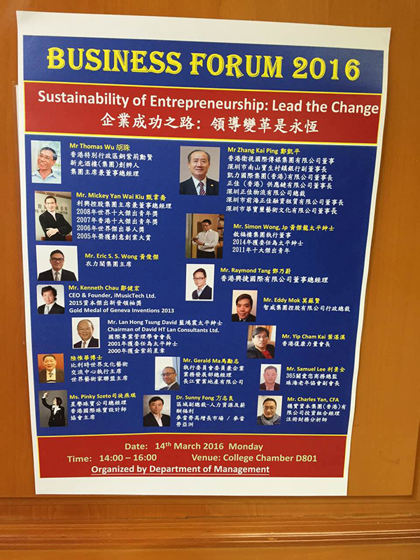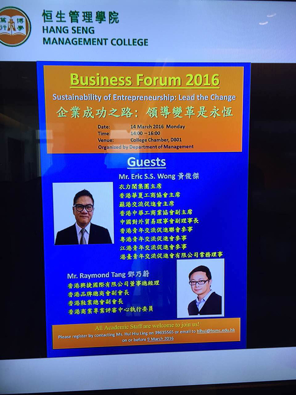 3月14日,恒生管理學院管理學系主辦《商業論壇;企業成功之路領導變革是永恆 》在新界沙田小瀝源行善里舉行。